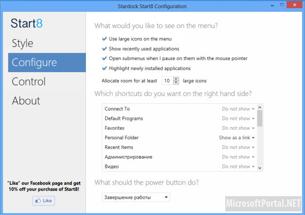 ![]() После определения с внешним видом кнопки и меню, можно перейти к содержанию. Start 8 может показывать в меню недавно использованные программы, и выделять только что установленные. Также можно настроить ссылки в правой части меню и поставить, какое действие по умолчанию будет назначено кнопке выключения.
