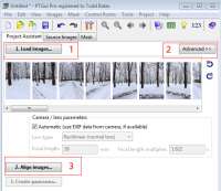 Это можно сделать в нескольких программах, но первая, которую мы рассмотрим - PTGui Pro. Это приложение обладает обширными возможностями и в то же время доступна новичкам, т.к. имеет два режима: Advanced - расширенный для продвинутых и Simple - для начинающих. Запускаем PTGui Pro: Первым делом, загружаем исходные фотографии - кнопка Load images (1), открываем все фотографии (36 фото) кроме зенита и надира, их мы вставим в готовую панораму позже. Включаем расширенный режим - Advanced (2), " Camera/ Lens parameters" оставляем как есть и жмем Align Images (3), тем самым запускаем процесс просчета и генерации контрольных точек между соседними кадрами и объединение панорамы. После завершения этого процесса появляется окно Panorama Editor , в котором можно увидеть первые результаты: Сразу видно, что наша панорама сшилась как надо, без особых помарок, это означает, что программе хватило информации, содержащейся в зоне перекрытия кадров, и сгенерировано достаточно контрольных точек. Если же программе не удалось найти общих фрагментов в соседних фото, значит необходимо проставить контрольные точки вручную. Чтобы увидеть, где именно не хватает контрольных точек, нажимаем кнопку в виде лампочки Control Point Assistant :