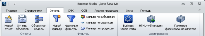 Информация, которая ранее располагалась в дополнительных окнах, теперь выведена сразу в таблицу выбора баз. Информацию о версии базы данных и используемом сервере лицензий сообщает всплывающая подсказка. При необходимости можно, минуя окно выбора, напрямую попасть в любую базу - достаточно создать ярлык на рабочем столе от любого соединения. Также поддерживаются стандартные возможности Windows: можно закрепить ссылку запуска баз в меню "Пуск" или панели задач. ДизайнВ новой версии Business Studio впервые появилась возможность выбора темы оформления. Теперь пользователь сам решает, в какой цветовой гамме он предпочитает видеть интерфейс программы - возможны порядка 40 вариантов: от стандартной цветовой схемы, приближенной к стандартам web 2.0 для дизайна, до забавных "Весенней" темы или темы "Валентинка". МенюДля более удобного обзора имеющихся возможностей в главном меню теперь применяются ленты. Они помогают обеспечить настройку системы в соответствии с индивидуальными потребностями: есть возможность создавать новые пункты меню, а также формировать новые меню и давать права пользователям и их группам на различные меню. Таким образом, каждый пользователь может настроить меню под собственные нужды. Такая персонализация упрощает поиск функций и ускоряет изучение системы, в итоге пользователи смогут чувствовать себя увереннее при освоении Business Studio: доступ к часто используемым командам стал быстрее и удобнее. Навигатор