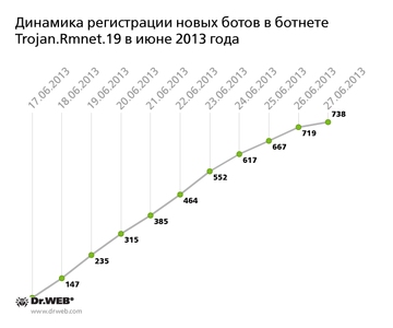 БотнетыВ июне 2013 года появилась новая версия бота Linux.Sshdkit, о котором компания "Доктор Веб" сообщала в феврале 2013 года. По данным на 27 июня в бот-сети, созданной злоумышленниками с использованием предыдущей версии троянца, насчитывается всего лишь 42 активных бота, а в течение последних 30 дней было зафиксировано только 8 случаев заражения новых серверов, работающих под управлением операционной системы Linux. В то же время продолжается рост числа заражений файловым вирусом Win32.Rmnet.12. В первой из вирусных подсетей, управляющие сервера которых исследуются специалистами "Доктор Веб", на сегодняшний день числится 459 192 бота, во второй - 613 135. График регистрации в обеих подсетях ботнета вновь инфицированных рабочих станций в июне 2013 года продемонстрирован ниже: Ботнет Win32.Rmnet.16 насчитывает в настоящий момент 4 674 активных бота (в прошлом месяце их было 5 220), при этом в течение месяца к сети присоединилось всего лишь 239 инфицированных компьютеров. Немного сократилось и количество рабочих станций, на которых были обнаружены вредоносные модули, детектируемые антивирусным ПО "Доктор Веб" как Trojan.Rmnet.19. В мае данная бот-сеть насчитывала 20 235 инфицированных ПК, а по данным на 27 июня их было уже 15 611. Замедлилась и динамика роста ботнета, которую можно проследить на представленной ниже диаграмме. Если в мае на управляющем сервере зарегистрировалось 8 447 вновь инфицированных машин, то в период с 17 по 27 июня было зафиксировано всего лишь 738 случаев заражения: Немного сократились и размеры ботнета, образованного с использованием троянской программы BackDoor.Bulknet.739, о перехвате контроля над одним из управляющих серверов которой компания "Доктор Веб" сообщила ранее. Если в мае данная сеть насчитывала 17 242 инфицированных компьютера, то в конце июня число активных ботов составило уже 16 024. Динамику регистрации на управляющем сервере вновь инфицированных рабочих станций можно проследить на представленной ниже диаграмме: Почти не изменилась численность ботнета BackDoor.Dande, состоящего из компьютеров фармацевтических компаний и аптек, зараженных одноименным бэкдором: сейчас в одной из известных специалистам "Доктор Веб" подсетей их количество составляет 1 209, уменьшившись на 92 ПК по сравнению с прошлым месяцем, в другой - 268 (на 63 компьютера меньше, чем в мае). Также незначительно сократилась популяция Apple-совместимых компьютеров, инфицированных троянской программой для Mac OS X BackDoor.Flashback.39, однако этот процесс продвигается не столь быстро, как хотелось бы. На 27 июня в ботнете BackDoor.Flashback.39 насчитывается 62 069 зараженных "маков", что на 3 918 единиц меньше, чем в мае. Угроза месяцаВ июне семейство вредоносных программ для ОС Linux пополнилось новой модификацией троянца Linux.Sshdkit. Обновленная версия угрозы, предназначенной, как и ее предшественница, для похищения логинов и паролей на работающих под управлением платформы Linux серверах, получила наименование Linux.Sshdkit.6. В данной версии Linux.Sshdkit злоумышленники внесли ряд изменений с целью затруднить перехват вирусными аналитиками украденных паролей. Так, вирусописатели изменили метод определения адресов серверов, на которые троянец передает краденую информацию. Теперь для вычисления целевого сервера используется специальная текстовая запись, содержащая данные, зашифрованные RSA-ключом размером 128 байт. Алгоритм генерации адреса командн