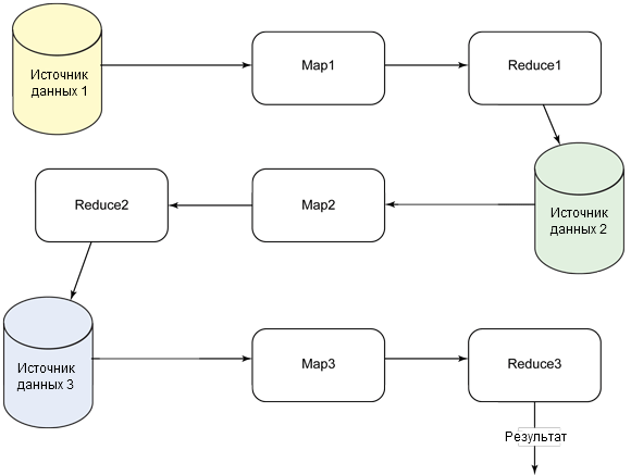 }Это упрощенные примеры, призванные продемонстрировать мощность и гибкость метода map/reduce, но они дают представление о том, как работать с различными форматами документов и структурами своих источников информации и как обобщать и извлекать информацию в ходе этого процесса. Цепочка операций map/reduceКак видите, map/reduce ― это практический метод синтаксического анализа и обработки больших объемов данных независимо от того, хранится ли исходная информация в подходящей базе данных. Однако метод map/reduce имеет ограничения на количество информации, связанной (явно или неявно) через различные документы, которые можно объединять и включать в общий результат. К тому же для очень сложной информации один процесс map/reduce может оказаться не в состоянии выполнить обработку за один проход. Невозможность использовать оператор JOIN для объединения информации из разных таблиц (включая ту же таблицу), как в традиционных РСУБД всех видов, не позволяет делать определенные операции в рамках map/reduce за один шаг. Например, при обработке текстовой информации и выполнении тематического анализа данных процесс можно пройти, сначала обработав информацию и предложения из исходного материала, а затем разделив эти исходные данные на отдельные блоки документов. Это делается с помощью простой функции map(), которая обрабатывает информацию, создавая новые документы. Вторым шагом будет обработка извлеченной информации для более детального анализа отдельных фрагментов и сопоставления и подсчета этой информации (см. рисунок 3). Рисунок 3. Обработка извлеченной информации для более детального анализа