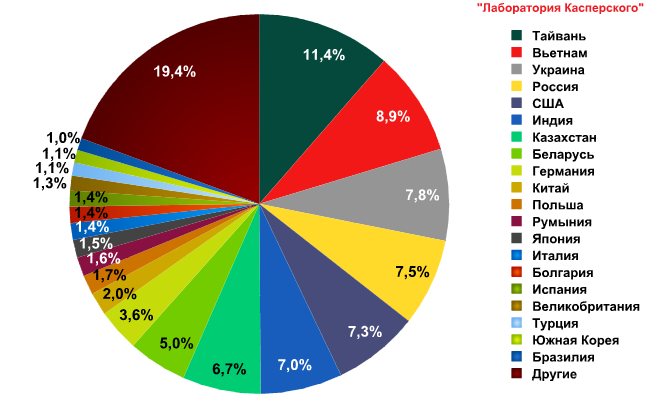 Третье место занимает Южная Корея (11,4%), доля которой в апреле увеличилась на 1,5%. Сохранил свое место в первой пятерке Тайвань (5,5%). Индия, занимавшая по итогам марта пятую строчку, потеряла всего 0,5%, но опустилась на четыре позиции вниз и теперь занимает 9-ю строчку с показателем 2,9%. На 5-е место вышел Вьетнам (4%). Показатель России (3,3%) увеличился на 1%, что позволило ей подняться в рейтинге с 10-го на 7-е место. Германия (1,6%), занимавшая ранее 8-ю строчку, по итогам апреля потеряла около 1% и заняла 12-е место. Италия потеряла 2,1% и спустилась с 6-го места на 14-е. Ситуация со спам-потоками в Рунете по итогам апреля выглядит следующим образом: