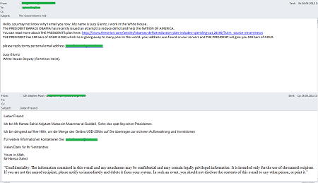 Отметим, что подобную вредоносную рассылку мы уже наблюдали в первом квартале 2013 года. В письмах с очень похожим оформлением злоумышленники использовали новости, касающиеся нового Папы Римского, актуальные в марте. В рамках еще одной рассылки злоумышленники распространяли ссылки на веб-страницы со словами texas, boston, news в адресе. Пройдя по такой ссылке, пользователь попадал на страницу с подборкой видеозаписей взрывов, взятых с сайта Youtube. На этой же странице содержался эксплойт, который загружал на компьютер пользователя вредоносную программу, детектируемую "Лабораторией Касперского" как Trojan-PSW.Win32.Tepfer.Этот троянец используется злоумышленниками для кражи пользовательских аккаунтов (логин и пароль) с зараженных компьютеров. МошенничествоМошеннические рассылки по-прежнему встречаются очень часто. Чтобы выманить у жертв денежные средства, спамеры регулярно придумывают новые уловки и легенды, среди которых встречаются весьма необычные. В апреле нами были зафиксированы несколько мошеннических спам-рассылок на русском языке. В одной из них злоумышленники использовали хорошо известный прием для привлечения внимания пользователя: к получателю обращается якобы хорошо знакомый ему человек, это подчеркивается разговорным стилем письма. Этот "знакомый" обнаружил безопасный способ размножения электронных денег через сервис WebMoney и теперь хочет поделиться им с другом, т.е. с получателем письма. Для получения легких денег пользователь должен перечислить собственные средства на указанный в письме номер электронного кошелька и добавить к переводу особый код, использование которого якобы позволит жертве пополнять свой электронный кошелек без ограничений. Уловка, конечно, рассчитана на наивных неопытных пользователей, не знакомых с системой электронных денег. В другой рассылке мошенники проявили больше фантазии. Они предлагали получателям пожертвовать деньги на программу обучения русскому мату в американских школах и на издание в США соответствующих учебных материалов. В письме спамеры ссылались на то, что сбор денег через интернет очень эффективен, и подчеркивали, что нынешний президент США Барак Обама в ходе своей предвыборной кампании тоже прибегал к такому методу сбора пожертвований. Вряд ли эта басня поможет мошенникам собрать значительную сумму денег, однако возможность хищения данных банковских карт, которые доверчивый пользователь введет на сайте для сбора "пожертвований", ничуть не исключена. "Нигерийские"мошенники продолжают активно использовать имена известных политических лидеров всвоих письмах - на этот раз в рассылках фигурировали Барак Обама и сын Муаммара Каддафи. В письме, отправленном от имени служащей Белого Дома, сообщалось, что американский президент раздает 100 золотых слитков нуждающимся по всему миру и именно получатель письма станет владельцем ценного металла. А в"нигерийском" письме на немецком языке, написанном от лица помощника сына бывшего президента Ливии Муаммара Каддафи, содержалась традиционная просьба о помощи в переводе и обналичивании миллионов. Сценарий развития подобного мошенничества один: как только человек вступает в переписку, мошенники просят у него незначительныe суммы денег на покрытие расходов посредника или оформление документов. Спамеры рассчитывают на то, что огро