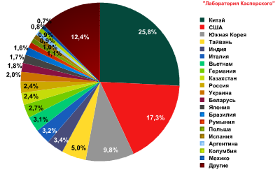 На первом месте по-прежнему находится вредоносная программа Trojan-Spy.html.Fraud.gen (6,9%), однако ее доля по сравнению с прошлым месяцем уменьшилась на 4,1% пункта. Напомним, что этот троянец представляет собой html-страничку, имитирующую регистрационную форму сервиса онлайн-банкинга. Если пользователь вводит свои данные в предложенные поля и нажимает на кнопку отправления, его личная информация попадает к мошенникам. На второе место вышел Trojan.win32.Bublik.aknd. Эта вредоносная программа собирает с зараженного компьютера пользователя пароли от FTP, данные для авторизации на почтовых сервисах, сертификаты. Кроме того, она может просматривать формы в браузерах Mozilla Firefox и Google Chrome в поисках сохраненных логинов и паролей. Найденные данные программа отправляет злоумышленникам. На третьем месте находится вредоносная программа Email-Worm.Win32.Bagle.gt. Почтовые черви часто попадают в TOP-10, так как их основной функционал - рассылать свои копии по контактам в адресной книге пользователя. Черви семейства Bagle могут связываться с командным центром и устанавливать на зараженный компьютер другие вредоносные программы. Помимо прочего, в первую десятку в этом месяце вошли вредоносные программы семейства Trojan-Ransom, вымогающие у пользователей деньги за доступ к операционной системе или программам (обычно требуется отправить платное SMS). Обнаруженные нами модификации троянской программы Trojan-Ransom.Win32.Blocker блокируют работу операционной системы и вешают на Рабочем столе баннер с условиями разблокировки. Мы хотим напомнить читателям, что не следует идти на поводу у киберпреступников и платить злоумышленникам деньги. Чтобы разблокировать компьютер, воспользуйтесь нашим бесплатным сервисом: sms.kaspersky.ru. Распределение срабатываний почтового антивируса по странам