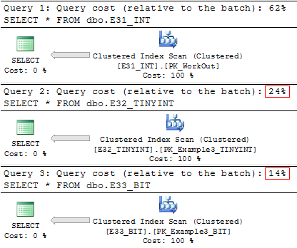 (185916 row(s) affected) SQL Server Execution Times: (185916 row(s) affected) SQL Server Execution Times: Пятое. В каждом правиле есть свои исключения. Я показал пару примеров, когда изменение типов данных на менее избытоные позволяет сократить время выполнения запроса. Но это бывает не всегда. Например, у типа данных BIT есть одна особенность - SQL Server оптимизирует хранение группы столбцов этакого типа на диске. Например, если в таблице имеется 8 или меньше столбцов типа BIT , они хранятся на странице как 1 байт, если до 16 столбцов типа BIT , они хранятся как 2 байта и т.д. Хорошая новость - таблица будет занимать существенно меньше места и сократит количество дисковых операций. Плохая новость - при выборке данных этого типа будет происходить неявное декодирование, которое очень требовательно к ресурсам процессора. Покажу это на примере. Есть три идентичные таблицы, которые содержат информацию о календарном графике сотрудников (31 + 2 PK столбца). Все они отличаются только типом данных для консолидированных значений (1 - вышел на работу, 0 - отсутствовал):