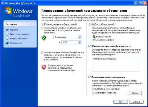 Управление настройками компьютеров и учетных записей учеников средствами Windows SteadyStateПосле установки Windows SteadyState вы сможете на рабочем столе найти ярлык "Windows SteadyState", который предназначен для открытия программы. Как видно на следующей иллюстрации, в программе Windows SteadyState контрольной точкой доступа к конфигурированию настроек компьютера и пользователя является главное окно программы. Это окно можно условно разделить на две части, а именно "Глобальные параметры компьютера", которые можно использовать для установки общесистемных ограничений, настройки расписания обновлений и защиты системного раздела, а также "Параметры пользователей", которые предназначены для установки ограничений для конкретных пользователей. Увеличить рисунок В состав "Установки ограничений компьютера" входят параметры конфиденциальности, параметры безопасности и прочие параметры. Параметры конфиденциальности позволяют Вам скрыть на экране входа в систему имя последнего пользователя, который работал за этим компьютером. Помимо этого Вы можете запретить отображение и использование заблокированных или перемещаемых пользовательских профилей в экране входа в систему, а также запретить кэшировать копии указанных выше профилей, которые ранее входили в систему для экономии свободного пространства и повышения безопасности. При помощи параметров безопасности вы можете защитить пользовательский компьютер от возможных повреждений, выполненных вашими учениками. В данной группе доступно семь различных параметров, отвечающих за запрещения сохранения паролей, папок и файлов на диске С, записи на внешние накопители, удаление параметров завершения работы и выключения компьютера из экрана приветствия, а также запрещение открытия документов Microsoft Office из браузера. Группа "Другие параметры" предназначена для отображения списка имен пользователей на экране приветствия при каждом запуске операционной системы Windows XP. Несмотря на то, что для локального использования данную опцию лучше оставить, в случае если ваш компьютер находится в домене Active Directory, эта опция не будет активна по умолчанию. Увеличить рисунок Всегда стоит обращать внимание на поддержание ваших операционных систем и программного обеспечения в обновленном состоянии, что обеспечивает более высокий уровень стабильности. Как вы видите на иллюстрации, раздел "Планирование обновлений программного обеспечения" позволяет Вам установить время и частоту установки автоматических обновлений, а также обновлений для программ безопасности. Несмотря на то, что при помощи SteadyState устанавливается большинство обновлений, все-таки рекомендуется периодически просматривать доступные обновления в центре загрузки обновлений Windows Update, так как рекомендуемые и необязательные обновления устанавливаться не будут. Стоит обратить внимание на то, что если у вас развернут сервер обновлений WSUS, то Windows SteadyState будет загружать обновления непосредственно с вашего WSUS-сервера. Ученики постоянно стараются как можно серьезнее засорить жесткий диск, создавая множество ненужных файлов, загружая какие-то программы или различные файлы из Интернета, причем, после себя не возвращая все в исходное состояние. Windows SteadyState позволяет Вам защитить данные и системные параметры от постоянного изменения. Для этого в категории "Защита 