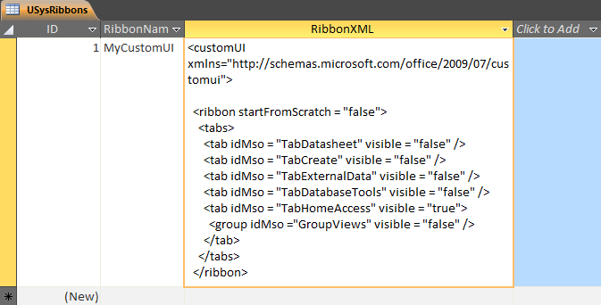 Настройка Ribbon Любой xml код будет начинаться с инициализации используемой схемы. В нашем случае необходимо указать: <customUI xmlns="http://schemas.microsoft.com/office/2009/07/customui"> </customUI> Весь код в данном примере можно разделить на 2 группы: первая описывает настройки Ribbon и заключается в тэги <ribbon></ribbon>, вторая - настройки представления Backstage™, тэги - <backstage></backstage>. Для тэга <ribbon> доступен атрибут startFromScratch. Тип данных - Boolean, т.е. принимает значения true/false. При значении true большинство стандартных элементов интерфейса скрывается. Удобно в том случае, если вы хотите полностью изменить меню (часто используется в серьезных приложениях). В нашем случае мы оставим этот атрибут со значением false, но при этом все-таки в явном виде укажем даже те вкладки (тэг <tab></tab>), которые мы хотим видеть. На самом деле для комфортной работы пользователю хватит вкладки Home, чтобы иметь доступ к форматированию, копированию и прочим действиям, не относящимся к разработке. Сослаться на стандартную встроенную вкладку мы можем с помощью атрибута idMso. Для большинства вкладок достаточно добавить к их оригинальному названию слово Tab и получится необходимый нам idMso. Исключением в данном случае является вкладка Home, значение атрибута для которой - TabHomeAccess. Все существующие объекты, а, соответственно, и значения idMso для них, моно найти в замечательном файле, который находится на сайте Microsoft http://www.microsoft.com/downloads/en/details.aspx?FamilyID=3F2FE784-610E-4BF1-8143-41E481993AC6. Чтобы скрыть ненужные вкладки, используем атрибут visible со значением false. В итоге, чтобы скрыть все вкладки, кроме Home, необходим следующий код: <ribbon startFromScratch="false"> <tabs> <tab idMso="TabDatasheet" visible="false" /> <tab idMso="TabCreate" visible="false" /> <tab idMso="TabExternalData" visible="false" /> <tab idMso="TabDatabaseTools" visible="false" /> <tab idMso="TabHomeAccess" visible="true" /> </tabs> </ribbon> Обратим внимание, что перед тем, как обратиться непосредственно к каждой вкладке, необходимо разместить секцию с тэгами <tabs></tabs>, уже внутри которой задавать атрибуты конкретных вкладкок. Вспомним, что на вкладке Home у нас есть элемент управления для выбора текущего вида объекта (таблица, дизайн, форма и т.д.). Очевидно, что пользователю она не нужна, т.к. его задача использовать приложение, а не изменять. Эта волшебная кнопка расположена в группе Views (группы - это следующий уровень детализации после вкладок, в каждой группе могут быть расположены элементы управления, например, кнопки, выпадающие списки и т.д.). Т.к. в этой группе всего 1 кнопка, то достаточно скрыть всю группу, не обращаясь непосредственно к элементу управления. Для этого внутри секции вкладки TabHomeAccess добавим секцию группы с idMso GroupViews и значением false атрибута visible: <tab idMso="TabHomeAccess" visible="true"> <group idMso="GroupViews" visible="false" /> </tab> Здесь уже не будем явно задавать значения атрибутов для всех других групп, т.к. неописанные группы унаследуют значение атрибута visible от своего родительского элемента вкладки, пока не будет явно указано обратное. Это можно было бы не делать и для вкладки Home, но т.к. нам необходимо дальше работать с группой Views внутри этой вкладки, то обозначить ее в коде все равно необходимо. Можно не указывать значение true для атрибута visible, т.к. при выборе значения false атрибута startFromScratch, все стандартые вкладки по умолчанию становятся видимыми. В примере атрибут указан явно исключительно для наглядности, чтобы показать разницу между скрываемыми и видимыми объектами интерфейса. Настройка Backstage™ Если внимательно изучить 