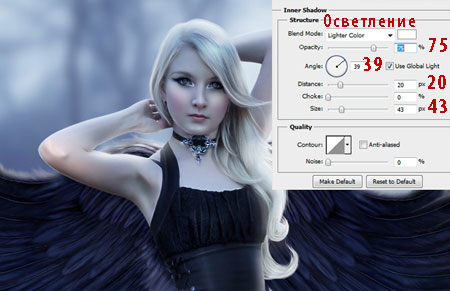 ШАГ 7 Выделите слой с моделью, далее, идём Слой - Стили слоя - Внутренняя тень (layer>layer style>Inner shadow) и применяем значения, которые указаны на скриншоте ниже.