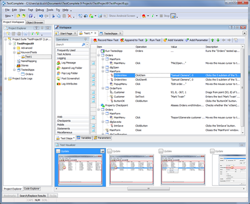 Разумеется, тесты можно не только записывать, но и редактировать или создавать с нуля. Для этого TestComplete включает редактор keyword тестов и встроенный редактор скриптов. Скриптовый редактор обладает всеми редакторскими "примочками": code completion, code templates, распахивание/скрытие кусков кода, закладки и т.д. Редактор keyword тестов поддерживает аналогичную функциональность. Оба редактора поддерживают отладку тестовых процедур, при этом во время отладки TestComplete автоматически переходить из одного редактора в другой. Например, вы выполняете keyword тест по шагам и попадаете на команду, которая вызывает скриптовую процедуру. TestComplete откроет редактор скриптов, где вы сможете продолжить выполнение скриптовых команд по шагам.