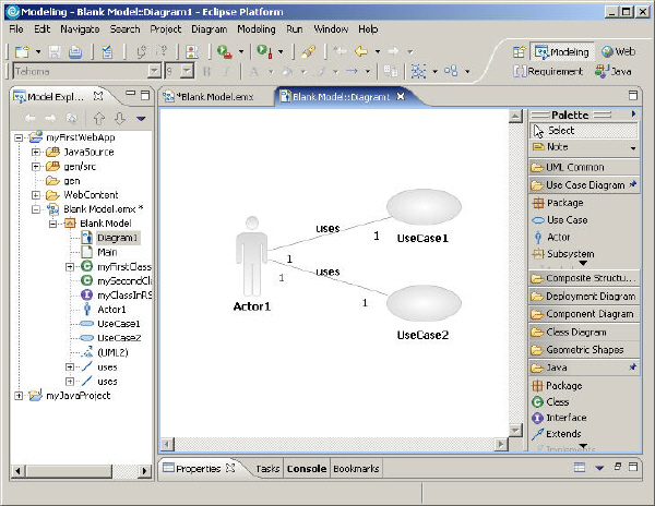Благодаря тому, что Rational Software Architect является совокупностью Rational Application Developer, Rational Web Developer и Rational Software Modeler, вы можете получить все эти инструменты, скачав Rational Software Architect. Практичность Rational Software Architect Будучи давним пользователем IBM Rational Rose, меня всегда раздражали проблемы, связанные с практичностью этого инструмента. Однако, этот релиз от IBM полностью основан на последней версии Eclipse 3.0 , что обеспечивает не только объединенный интерфейс для всех технических работников вашей команды (архитекторы, дизайнеры и разработчики), но также позволяет инструментам усиливать используемость возможностей, которую обеспечивает Eclipse. На Рисунке 1 показан основной интерфейс пользователя (UI) для Rational Software Architect. Рисунок 1. Пользовательский интерфейс Rational Software Architect. Так как Rational Software Architect основан на Eclipse, вы можете использовать Rational Software Architect для технологии Java 2 Platform, Enterprise Edition (J2EE Platform). Плюс, используя возможность генерирования кода, которая является частью Rational Software Architect, вы можете конвертировать в код схемы и UML-диаграммы, созданные в виде моделей. Наконец, лежащая в основе платформа Eclipse обеспечивает богатую возможностями интегрированную среду (IDE) для разработчиков. Rational Software Architect не ограничивается только Java-технологиями или J2EE-платформой. Вы можете конвертировать ваши UML-модели в код С++. Возможности инструментов генерировать код позволяють вам легко сгенерировать основной код, который вы сможете потом доработать. Эта особенность позволяет разработчикам улучшать возможности моделирования и конструирования шаблонов Rational Software Architect не только для J2EE-платформ. Основы Rational Software Architect Данная статья - практическая. Я советую вам запустить Rational Software Architect, читая эту статью. Если на вашей машине еще не стоит Rational Software Architect, вы можете скачать копию на странице "Trials and betas". Rational Software Architect представляет перспективу моделирования и несколько видов. Вид всех возможностей Rational Software Architect - это перспектива моделирования, где архитекторы и дизайнеры могут конструировать UML-диаграммы, использовать шаблоны и создавать подробные спецификации для разработчиков. Вы также можете генерировать код в этой перспективе. Чтобы все это реализовать, вам надо сделать следующие шаги: