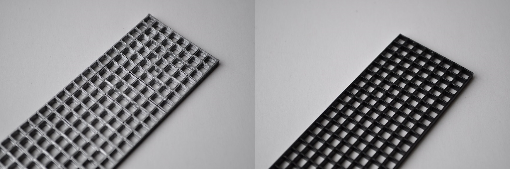 От конструкции "Reflector" требовалось повышенная точность, идеальные углы квадратиков и ровность стенок. В результате углы вышли закругленными, а одна сторона получилась "подплавленной" и неровной. Деталь не годилась для дальнейших испытаний. Решили переделать, используя технологию лазерной резки (материал - акрил). Точность детали вышла намного лучше. С помощью данной технологии также изготовили деталь "Screen".